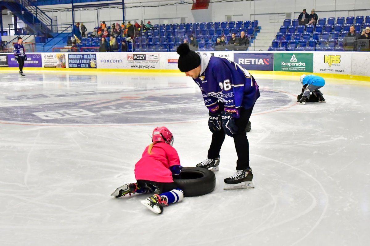 Disciplíny byly pestré a měly tempo. Štafety, přeskoky, vožení mantinelu, práce s pukem, hrazdičky… a nakonec i speciální výzva pro paní učitelky, které se do toho pustily s vervou, za kterou by se nestyděl ani zkušený bek. Bylo vidět, že si to užívají úplně všichni — děti, trenéři, rodiče i diváci.